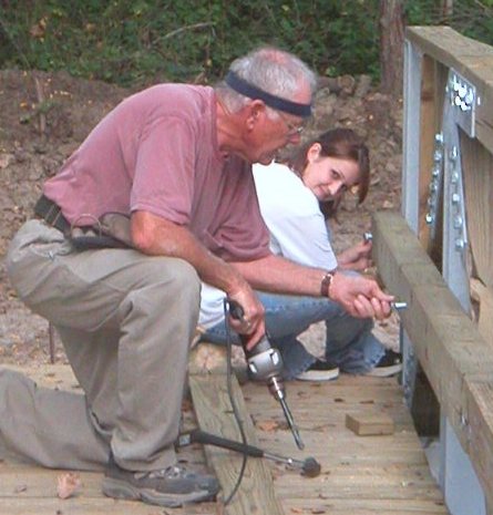 Dr. Larry Nash has been a pivotal volunteer with the Jefferson County Trails Council for many years. A fearsome worker, Larry likes to get an early start and work until dark. His talents run the range from supplying tools and materials: generators, drill bits, extension cords, and electric cutting shears, to bridge building, to having his granddaughter work on bridge building, to clearing downed trees on our walking trails, to building earthen erosion control, to helping obtain easements, to working his brush mower in tough-to-reach areas, to encouraging friends and family to donate to the trail project, to installing artwork on the bridges, to helping pour concrete, to pounding in sign posts, and on and on.